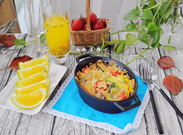 2,芝士焗飯(香菇、彩椒、小西紅柿)+百香果+鮮橙。時(shí)間匆忙的早上,焗飯也是個(gè)不錯(cuò)的選擇,第一天剩下的米飯加熱,香菇彩椒調(diào)味炒勻,拌上米飯,鋪上小西紅柿和芝士,交給烤箱后去催娃起床出來就能吃了!