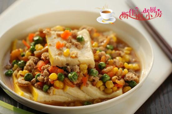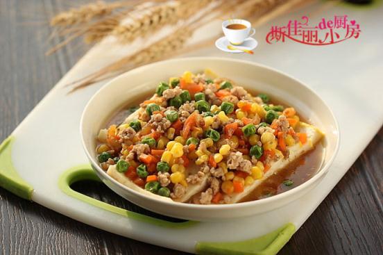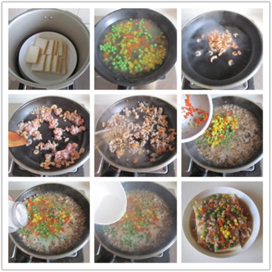 制作:1. 魚糕切成片后擺放盤中蒸熱; 2. 燒鍋開水,加入少許鹽和油, 下入青豆、玉米粒和紅蘿卜進去焯煮一下; 3. 熱鍋涼油, 放入泡過水的蝦仁煸炒; 4. 煸炒幾下后加入肉末煸炒; 5. 肉末煸炒變色后加入適量的料酒和生抽繼續(xù)煸炒; 6. 再加入少許水,并把剛焯過水的三丁倒入; 7. 加入鹽和胡椒粉調味; 8. 再加入適量的水淀粉勾芡; 9. 將煮好的肉末三丁澆淋在蒸好的魚糕上面;