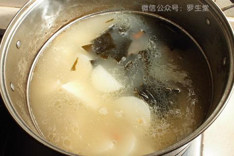 煮夠一小時(shí)后將蘿卜和海帶放下去再次燒開,依舊中火蓋鍋蓋煮半小左右,就可以了