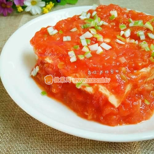 13.將炒好的番茄醬澆在豆腐上,撒點(diǎn)蔥花就可以了。
