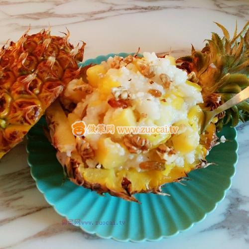 4.取蒸好的糯米飯加入冰糖果肉拌勻(有的菠蘿會(huì)澀可以用鹽水泡一下果肉)