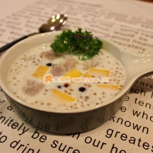 15.然后起鍋裝盤(pán),放入芒果丁,倒入椰奶即成。