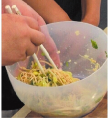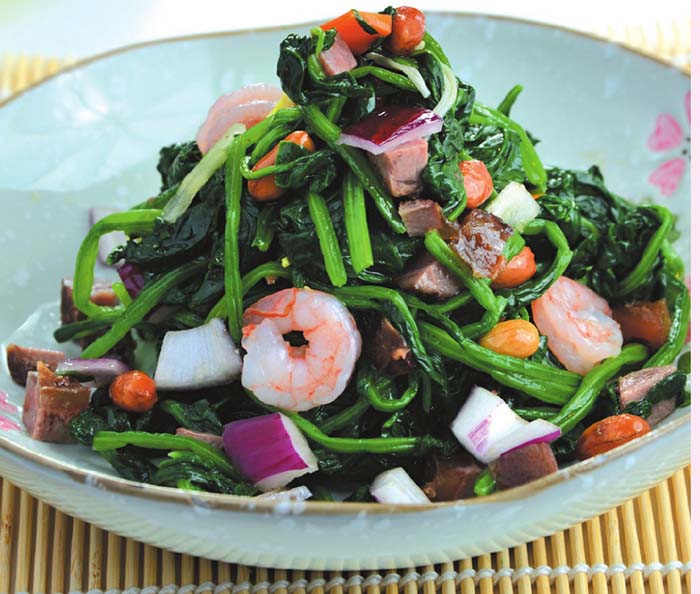 3將菠菜段、熟蝦仁放在容器內(nèi),放入蒜末、香菜段、火腿丁調(diào)勻。