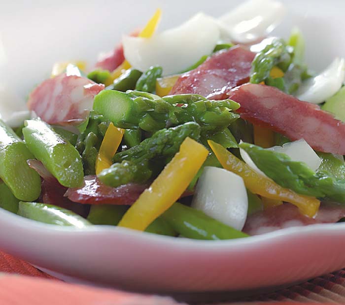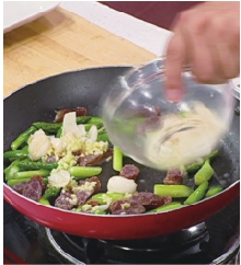 4凈鍋置火上,加入植物油燒至六成熱,放入燙好的蘆筍段、廣東香腸片稍炒,倒入調(diào)好的味汁熗炒均勻,撒上彩椒條,出鍋裝盤即可。