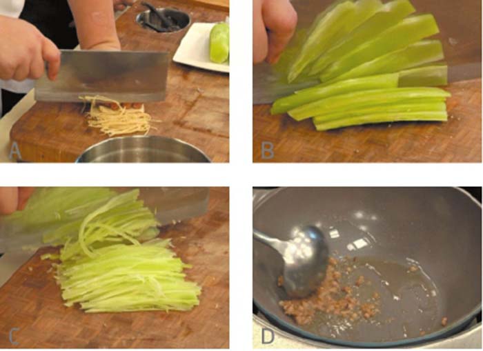1水發(fā)冬菇去蒂,洗凈,切成粗絲;萵筍去根,削去外皮,洗凈,切成粗絲;胡蘿卜去皮,洗凈,切成細絲。