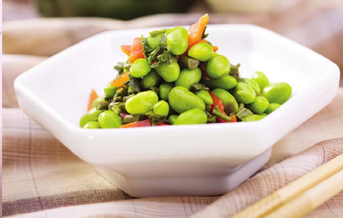 3將鮮蠶豆、香椿芽末放入小盆中,加入精鹽、味精、白糖、胡椒粉和陳醋調(diào)拌均勻,淋上燒至八成熱的香油拌勻,裝盤上桌即成。