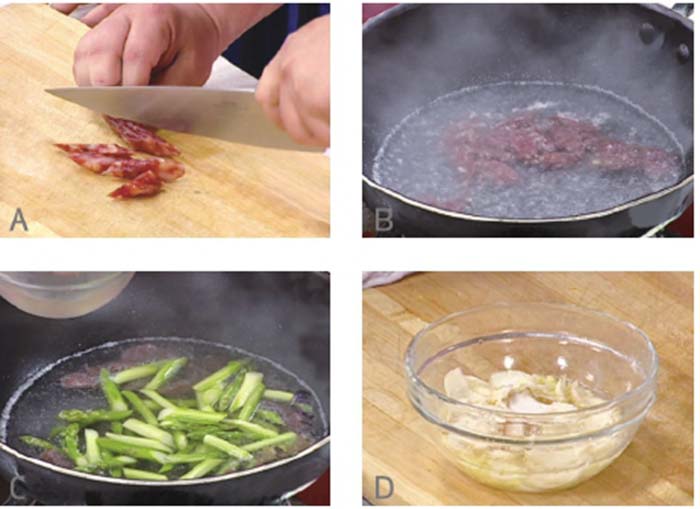 2鍋中加入適量清水、少許精鹽燒沸,放入廣東香腸、蘆筍段焯燙一下,撈出瀝干。