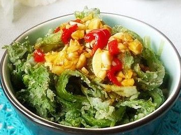 說明:這一步很關(guān)鍵,有不少朋友做出的蒸茼蒿發(fā)粘,就是因?yàn)闆]有晾干水分。但是,也不能晾的過干,否則面粉無法沾在葉面上。一般來說,以葉面上看不到明顯的水跡,剛好能沾上一層溥溥的面粉為宜。這個(gè)尺度是需要反復(fù)實(shí)踐的,多次幾次就掌握了。