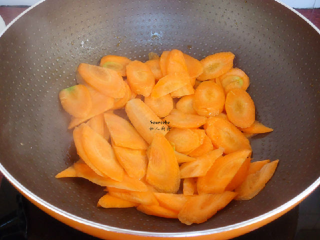 4.煎鍋臘腸的油鍋,不需要放油,爆炒胡蘿卜片;