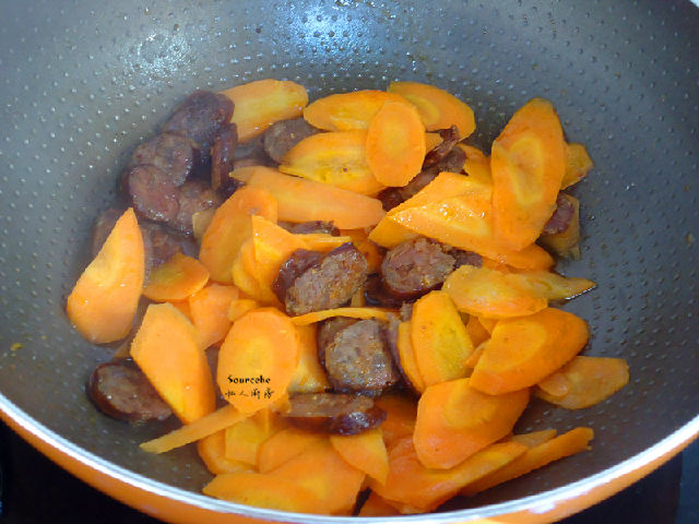 5.胡蘿卜片八成熟加入煎好的臘腸、生抽;