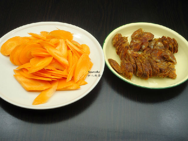 2.胡蘿卜洗凈去皮,切薄片,臘腸切薄片;