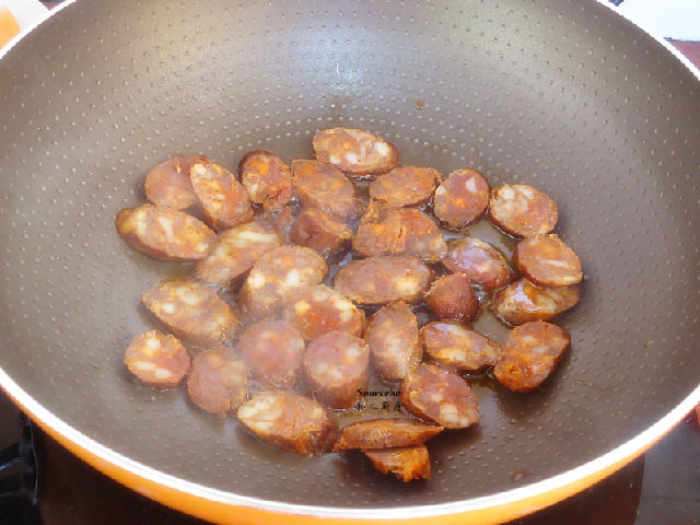 3.熱鍋,倒入一點點油,加入切好的臘腸,小火煎熟即可;