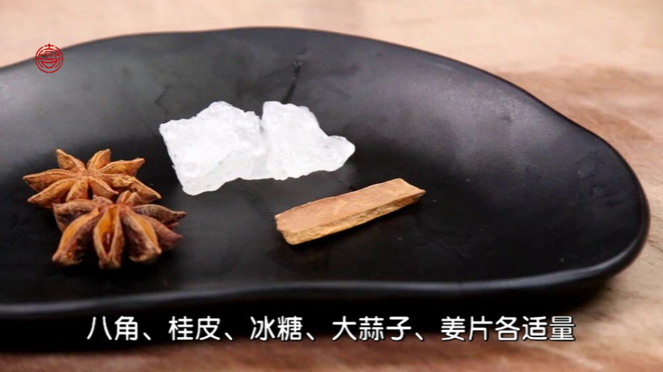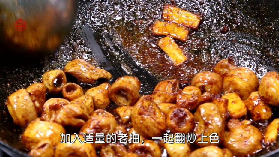 3、鍋燒熱去油,光鍋,下入八角、桂皮小火煸炒斷生。下入姜片爆香后,倒入肥腸轉大火煸炒,炒干肥腸的水氣,爆出肥腸的油份。爆出肥腸的油份后,加入冰糖和少量的水繼續(xù)煸炒,冰糖炒化,炒出糖色,粘在肥腸上,肥油基本爆出。將肥腸扒向鍋邊,打出多余的油份,下入辣妹子辣椒醬、阿香婆香辣醬和肥腸一起煸炒至醬料炒香。加入適量的老抽,一起翻炒上色。