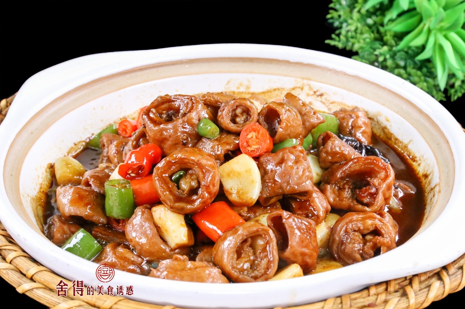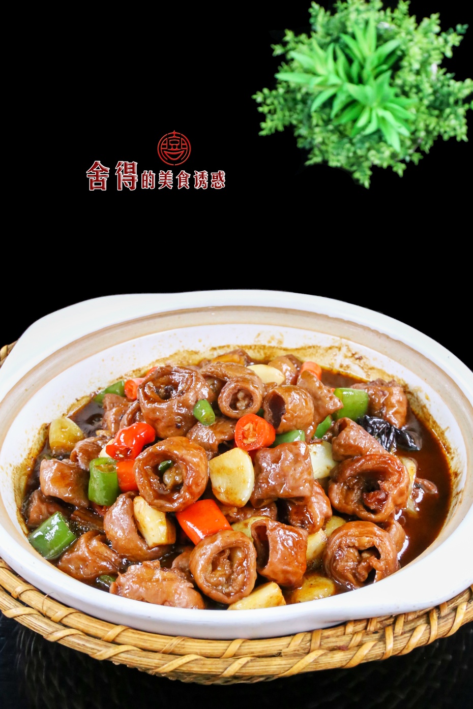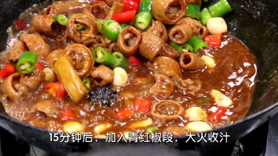 4、上色均勻后,加入1勺二鍋頭酒,蓋上鍋蓋燜15秒。15秒后開蓋,炒干多余的二鍋頭酒。加入足量的水淹過肥腸,加入適量的鹽、胡椒粉后蓋上鍋蓋,大火燒開轉小火煨40分鐘。40分鐘后開蓋并加入大蒜子扒均,繼續(xù)煨15分鐘。15分鐘后,加入青紅椒段,大火收汁。湯汁合適時,加入適量雞精翻炒均勻,將煲燒燙后加入洋蔥絲,將肥腸裝入煲中,美味即成。