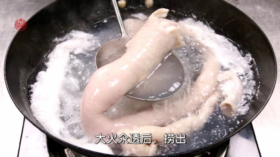 1、肥腸適量,放入盆中并加入適量面粉用手抓均,一節(jié)一節(jié)搓洗,再用水將肥腸表面的面粉洗凈。找到肥腸頭部翻轉過來,再次用水一邊沖一邊往里塞,肥腸就翻過來了。再次加入適量面粉用手搓洗后洗凈面粉,撕去肥腸內部多余的肥油,最后將肥腸翻轉過來。鍋里水燒開后下入肥腸,大火氽透后撈出,將肥腸切成合適大小的段,裝入碗中備用。