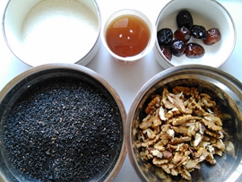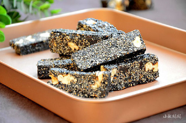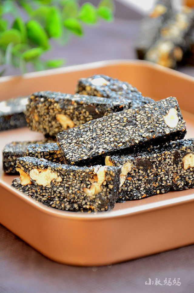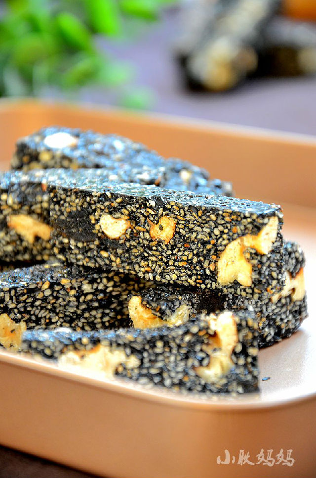 原料:黑芝麻300克 核桃仁100克 棗8只 白糖200克 麥芽糖230克 水150克