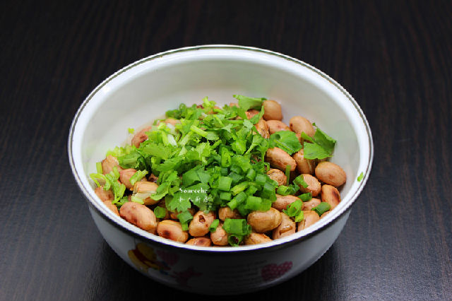 1.花生去殼,陳醋加入白砂糖拌均,香蔥、香菜洗凈切好;