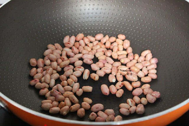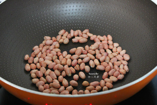 2.熱鍋,倒入花生米,小火慢慢炒;