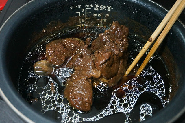 3. 牛腱子入電飯煲內(nèi)膽中,將調(diào)料、香料全部入鍋中,加夠足夠量的水;