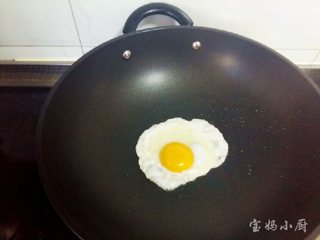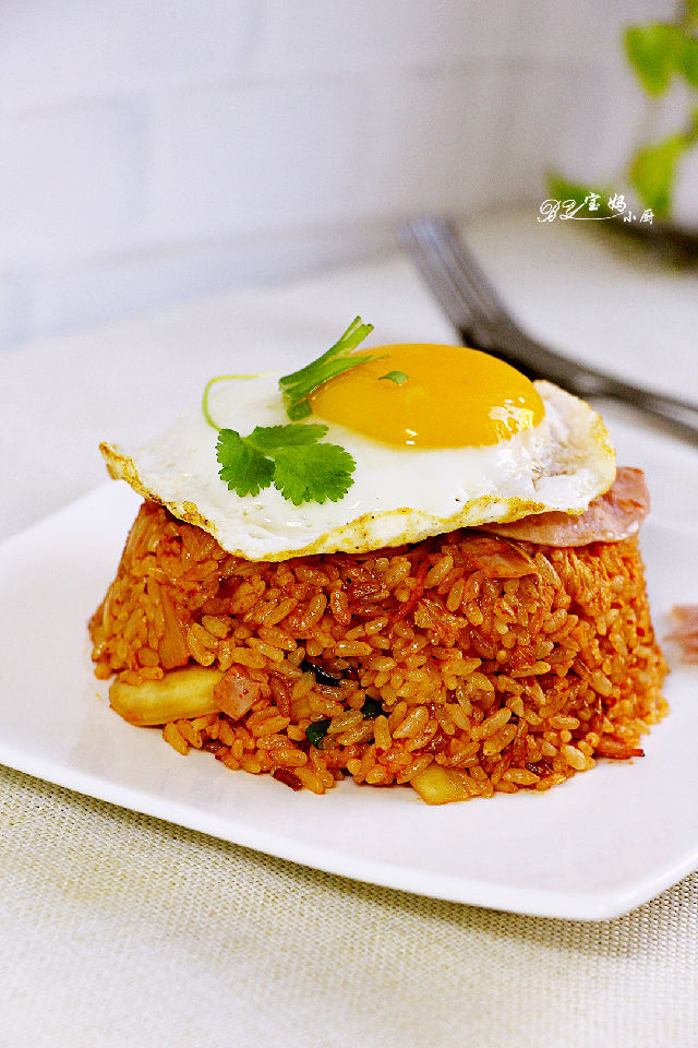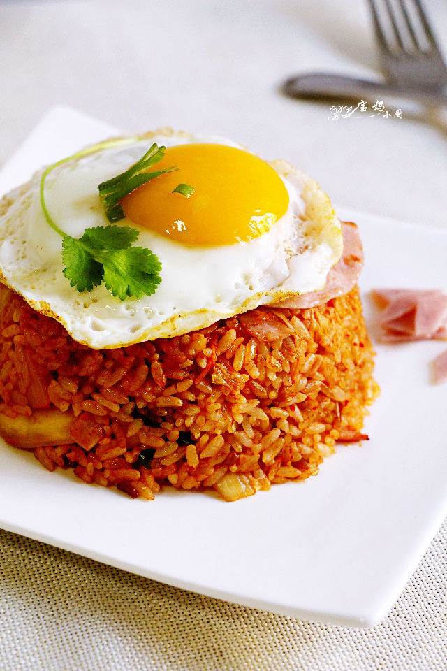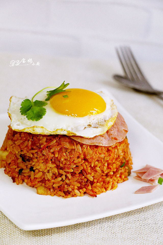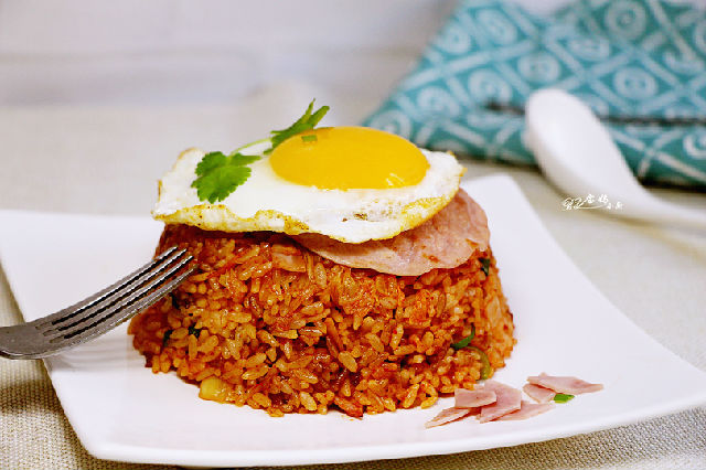 7 煎好的雞蛋蓋在火腿片上,這道辣白菜炒飯就做好了,食用的時(shí)候把雞蛋和熱乎乎的米飯一拌即可食用