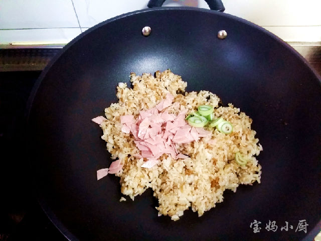 4 鍋內(nèi)加入植物油,加入蔥花爆香,放入醬油,倒入米飯翻炒至上色均勻,二次加入蔥花提香,放入切好的火腿片翻炒