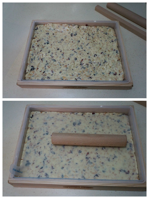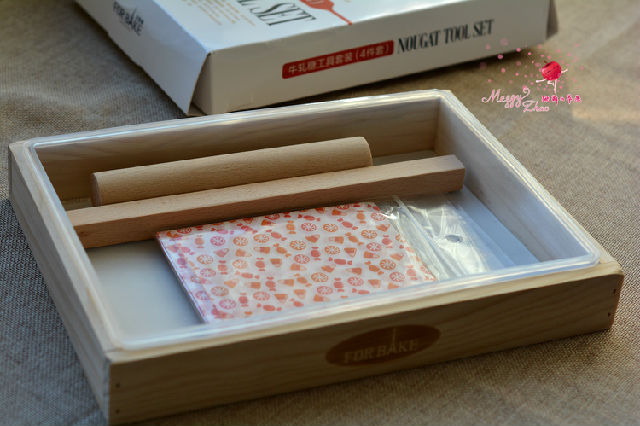 去年做牛軋?zhí)?,沒有模具,就直接將糖團放進不粘烤盤中搟的,所以糖片在厚度和成型上都不理想,今年可好了,有了法焙客牛軋?zhí)撬募?,還有一個整形用的木框,這牛軋?zhí)侵谱髌饋砜删褪×诵牧耍螤钜舱R漂亮了!