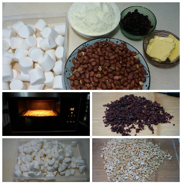 材料:棉花糖270克,黃油70克,脫皮花生300克,蔓越莓干60克,雀巢奶粉200克