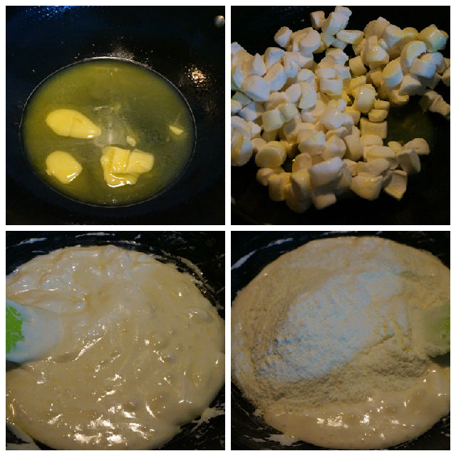 7. 將棉花糖倒入黃油中,不停地用刮鏟翻拌;