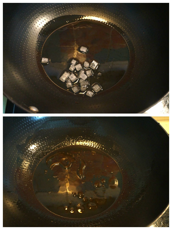 3. 炒鍋中倒少許油,將一小把冰糖入鍋中,小火炒化;