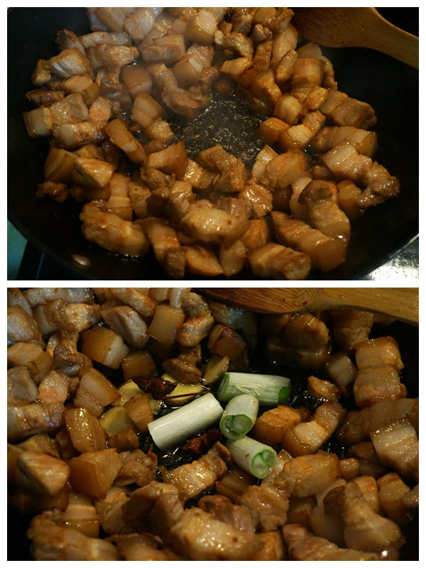 6. 將蔥段、姜片、八角入鍋中,翻炒出香味;