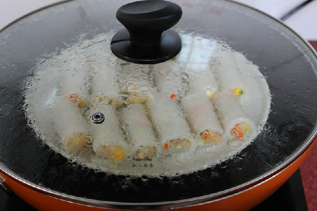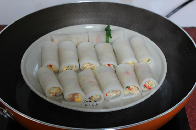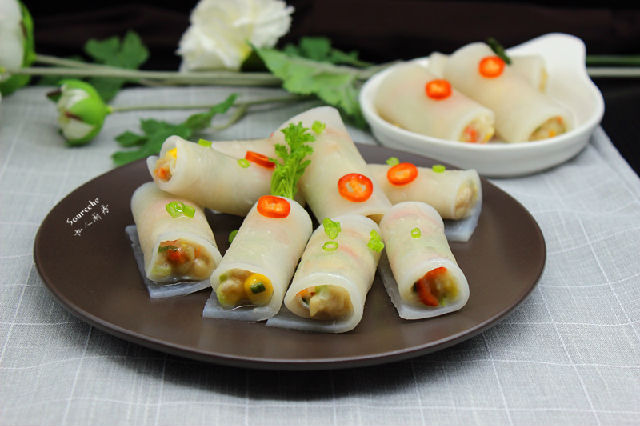5.晶瑩剔透的蘿卜片放入調(diào)好的餡料,卷起來;