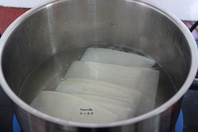 4.白蘿卜去二頭,洗凈去皮,切薄片,放入清水過鍋一下,過冷水瀝干放涼;