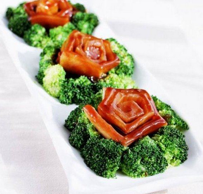 12.取出后碼放在盤中,香菇刻花焯水碼在盤中,西蘭花焯水取一小朵碼放盤中。鍋中倒入蠔油+適量的清水,中火至開,調上少許薄芡汁攪拌均勻。把蠔油汁淋在碼好的盤子上即可。