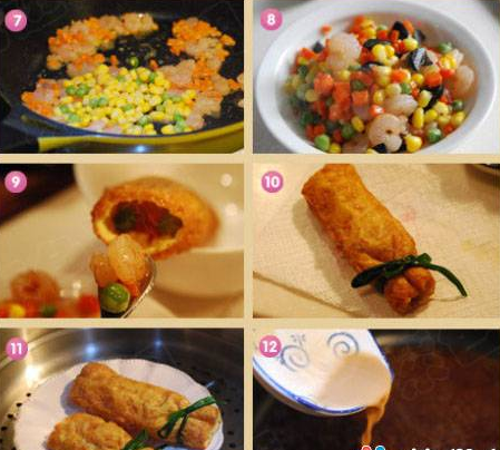 9.此時炸制的玉子豆腐稍涼,用小號長柄的勺子掏出內部的玉子豆腐,再把炒好的五種混合餡料填入。