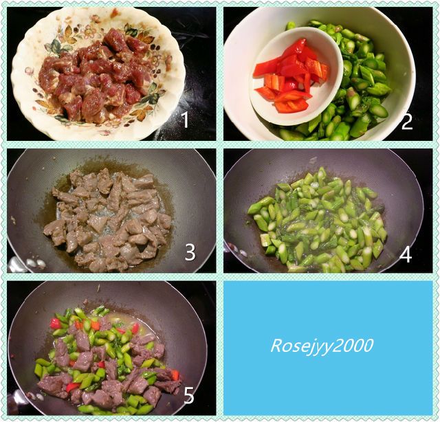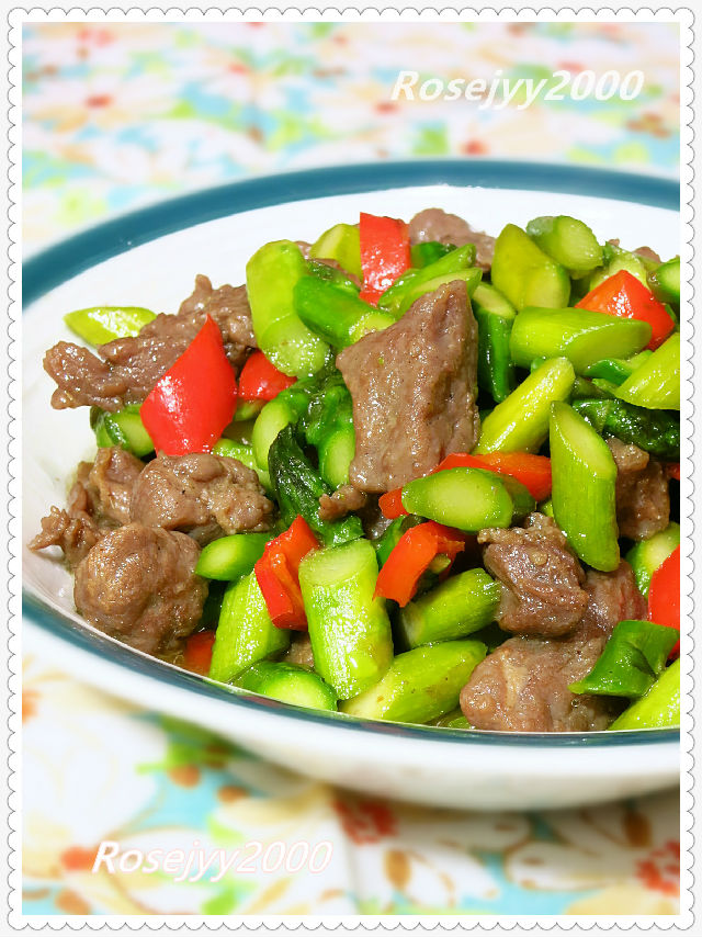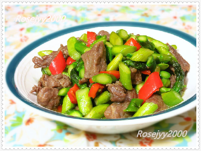 原材料:牛肉約150克,蘆筍約250克,紅燈籠椒1/2個,姜絲1撮。