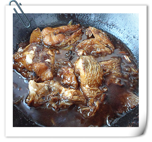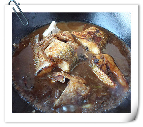 放入料酒,燉肉湯,醋,白糖,鹽,蔥姜蒜,添水,用中火熬魚。