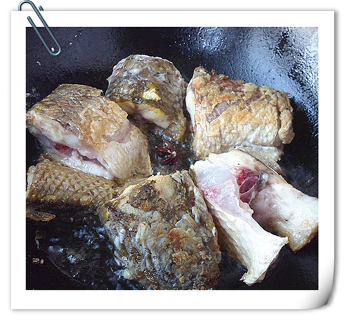 將梭魚塊,放油鍋里,放大料,梭魚煎成金黃色。