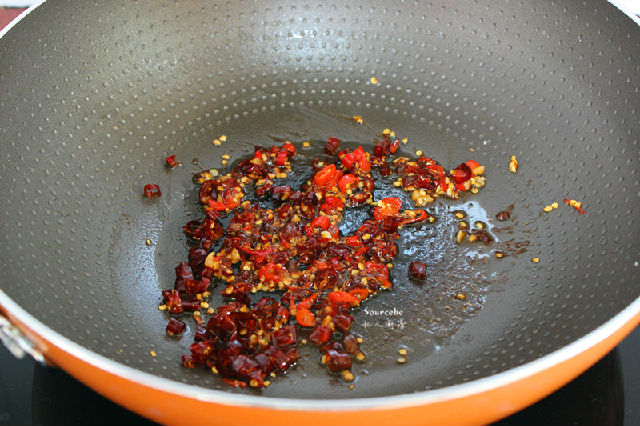 4.炒過花生的油,放入黃豆醬、干辣椒爆香,再加入香醋、生抽煮沸;