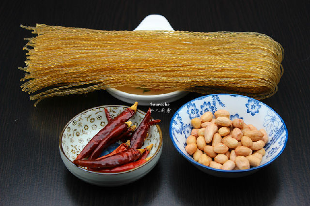 1.準備食材:紅薯粉、花生、干辣椒等;