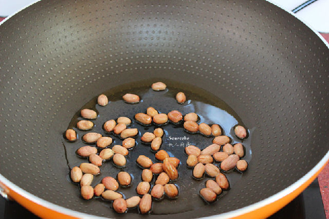 3.熱鍋,冷油,放入花生米,小火炒熟,趁熱曬一點鹽;PS:想花生米去皮就熱鍋熱油