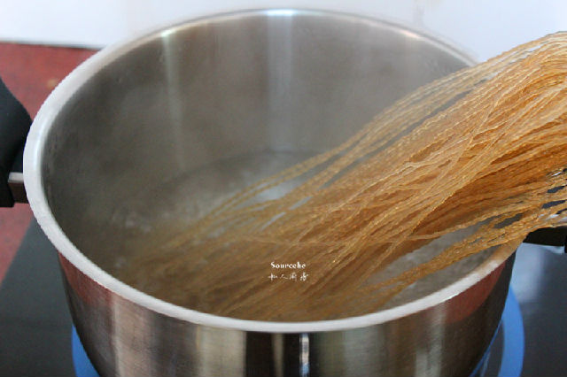 2.清水煮沸,放入紅薯粉,煮軟;PS:可以用熱水泡軟,時間長些