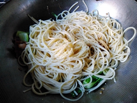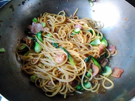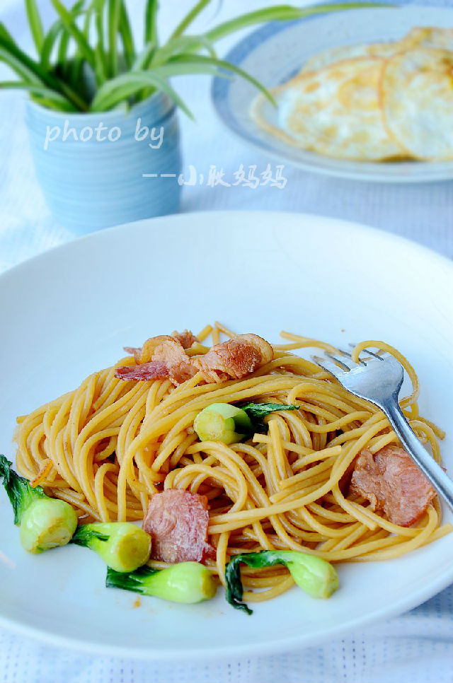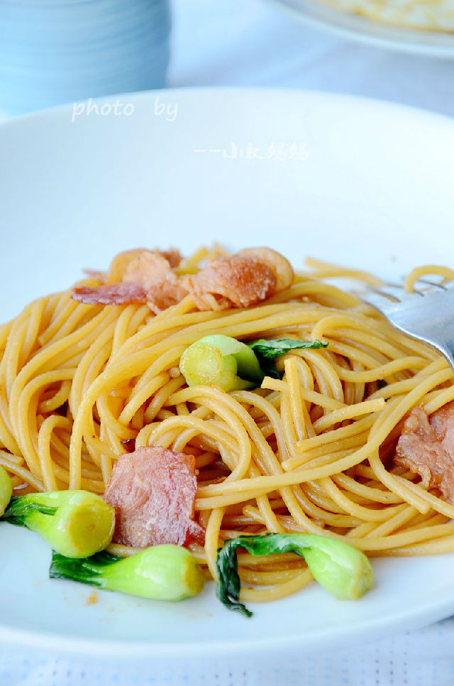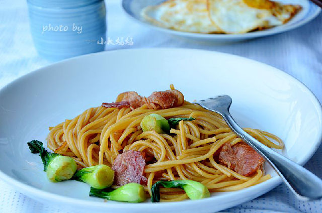中式的炒面油用得比較多,否則要粘在一起,用意面來代替中式的面條炒起來油就少用很多,當然會更健康,面條煮的時候不要太爛,有點嚼勁會更好,煮意面要花點時間,我一般頭天晚上煮好放冰箱,第二天早上加點培根,來點蔬菜,再煎個雞蛋,早起十分鐘就可以吃到一頓美味的早餐。