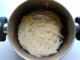 1.準備好原料,水燒開,加點鹽,放入意大利面條煮開,再小火煮一會兒,大約5分鐘左右,用筷子可以夾斷就行。