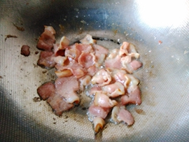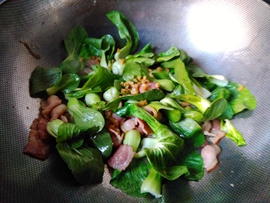3.熱鍋涼油,油要少,加入培根煎1分鐘左右,煎的時候火不要大,煎成表面微微發(fā)黃就行。再加入青菜翻炒1分鐘左右。