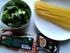 原料:意大利面條250克 培根100克 青菜150克 榨菜10克 生抽1勺 老抽0.5勺