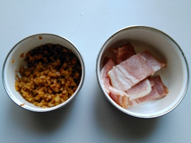 2.撈出過涼水,瀝干。培根切成小片,榨菜剁成沫。