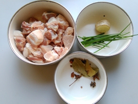 1.準(zhǔn)備好原料,五花肉加入香葉,八角,花椒,1勺料酒,蔥,幾片生姜,漫過肉的清水燒開。
