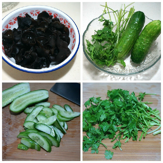 材料:泡發(fā)黑木耳一碗,黃瓜兩根,香菜兩棵,醋適量,生抽少許,鹽少許,山茶油少許,白糖少許