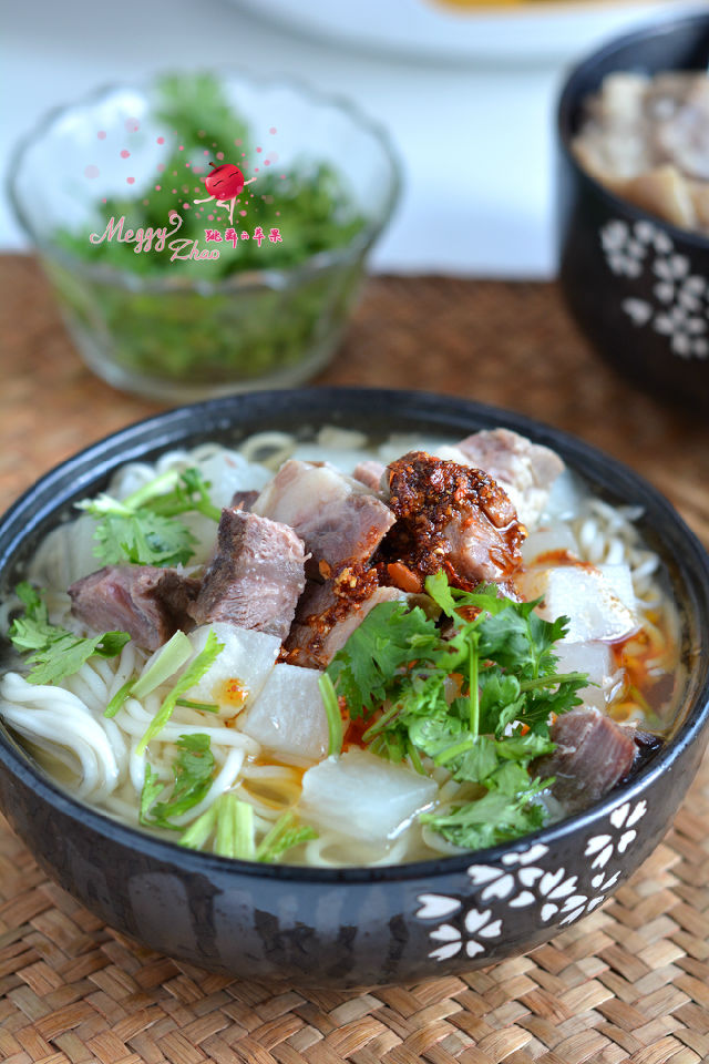如果怕上火,再切半根白蘿卜放進(jìn)湯里煲一會(huì)兒。這食材上的一熱一涼正好能互補(bǔ)一下。煮好的面條,舀上一大碗的羊湯,再加上羊肉白蘿卜,辣椒油是點(diǎn)睛之筆!這一碗下去,該有多么的心滿意足啊!