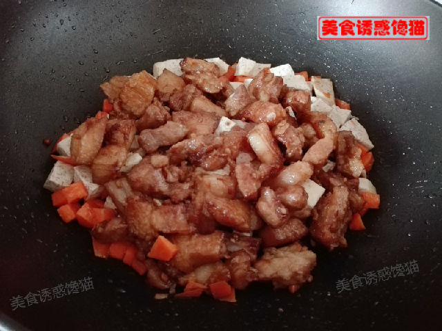 5、放入炒好的肉塊,翻炒勻。